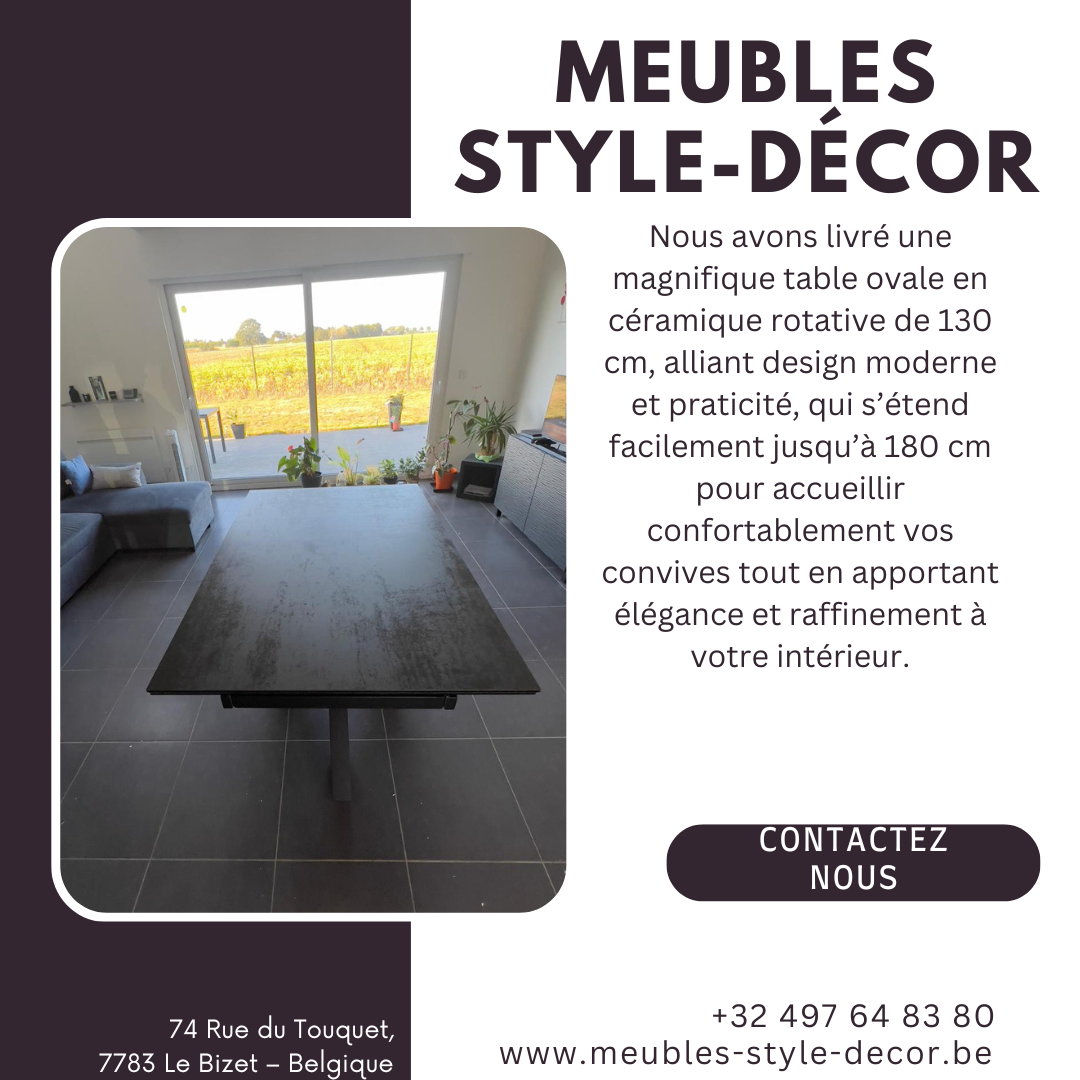 Chez SRL MEUBLES STYLE-DECOR, situé à Comines-Warneton, nous sommes fiers de vous offrir un vaste choix de tables de qualité, que ce soit en céramique ou en d'autres matériaux. Notre expertise en vente de meubles et en décoration nous permet de proposer des solutions adaptées à tous les styles et besoins. Que vous recherchiez une table ovale, carrée, rectangulaire ou même des formes organiques, nous avons ce qu'il vous faut. Avec ou sans allonge, notre sélection saura répondre à vos attentes. Nos clients ont déjà trouvé leur bonheur, notamment avec une table ovale en céramique de 130 cm qui s'étend jusqu'à 180 cm.