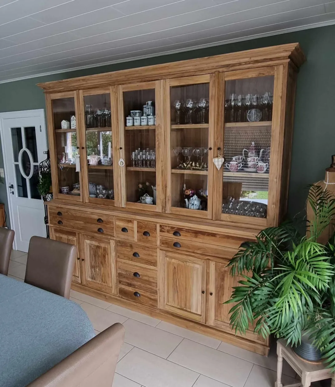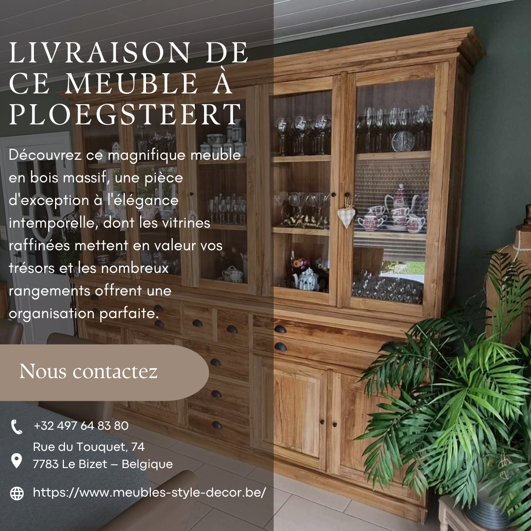 SRL MEUBLES STYLE-DECOR, votre spécialiste en mobilier et décoration à Comines-Warneton, est fier d'annoncer la livraison d'un meuble en bois massif à Ploegsteert. Ce meuble, véritable pièce d'exception, se distingue par son élégance intemporelle. Doté de vitrines raffinées, il met en valeur vos trésors tout en offrant de nombreux rangements pour une organisation parfaite.