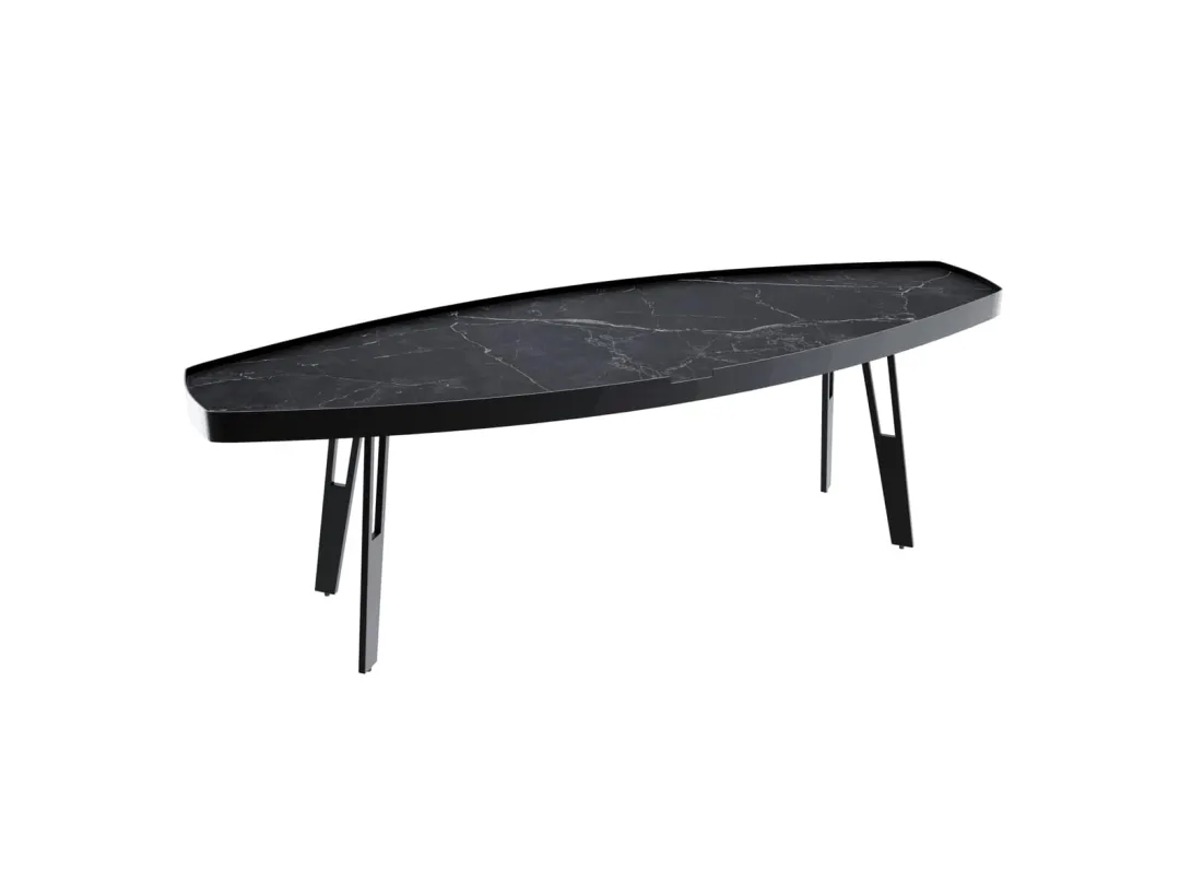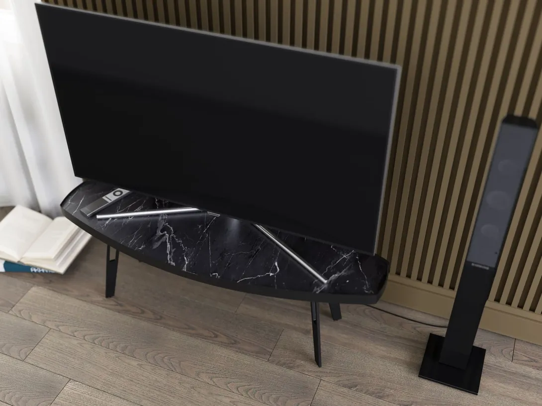 Ce meuble TV se distingue par son plateau en céramique disponible en deux coloris raffinés : Marbre Calcata et Marbre Marquina. Avec ses dimensions de 120 x 40 x 38 cm, il s'intègre parfaitement dans tout espace de vie. Les vêtements en acier laqué noir mat ajoutent une touche de modernité et de sophistication. Le modèle est également doté d'une ceinture noire en acier laqué, avec un effet bronze qui rehausse son allure.