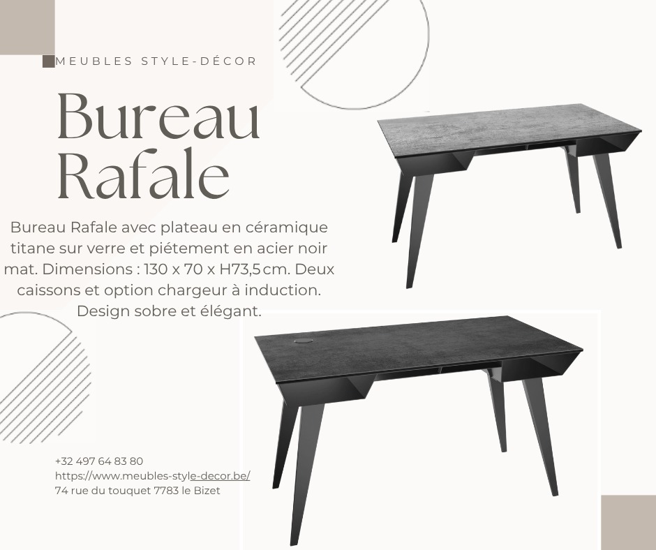 SRL MEUBLES STYLE-DECOR, votre spécialiste en mobilier et décoration à Comines-Warneton, est ravi d'annoncer la livraison du bureau Rafale à Cannes. Ce bureau allie élégance et fonctionnalité, avec un plateau en céramique disponible en deux coloris raffinés : titane et silver. Avec des dimensions de 130 x 70 x 73.5 cm, il s'intègre parfaitement dans tout espace de travail moderne.