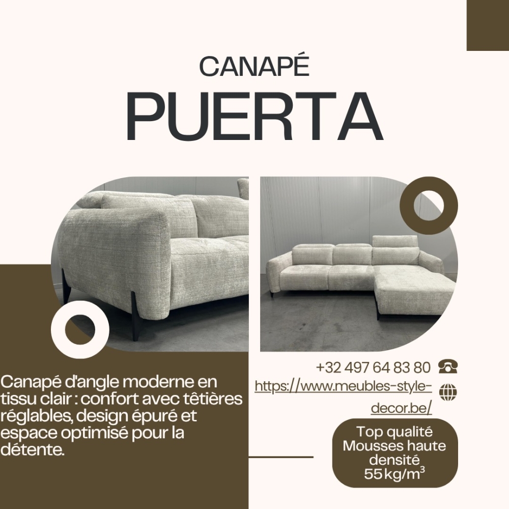 Chez SRL MEUBLES STYLE-DECOR, votre magasin de décoration et d’ameublement situé à Comines-Warneton, découvrez le canapé d’angle PUERTA, modèle moderne et raffiné désormais livrable jusqu’à Saint-Omer.