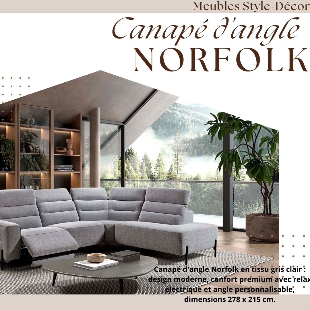 Bienvenue chez SRL MEUBLES STYLE-DECOR, votre expert en mobilier de qualité et en décoration à Comines-Warneton. Nous avons le plaisir de vous annoncer l'arrivée de notre dernier ajout à notre collection : le canapé d'angle Norfolk. Ce canapé, aux dimensions généreuses de 278 x 96 x 215 cm, est conçu pour offrir un confort exceptionnel et s'adapte parfaitement à votre espace de vie grâce à sa configuration réversible. Disponible également dans l'angle opposé, il mesure alors 215 x 96 x 278 cm.