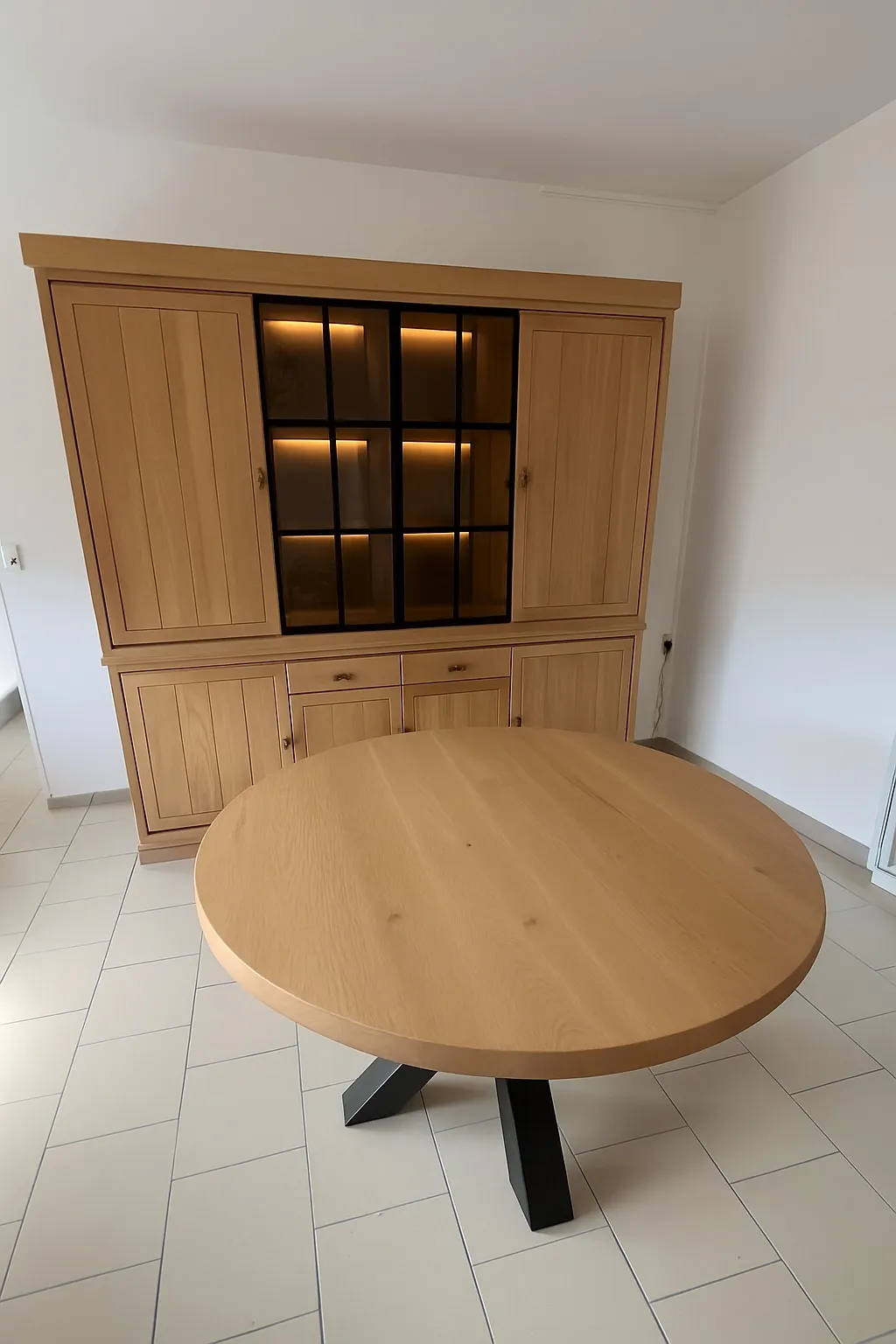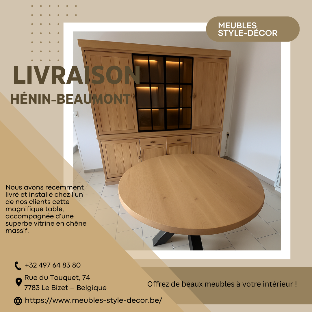 Chez SRL MEUBLES STYLE-DECOR, nous sommes fiers d'annoncer une nouvelle livraison réussie à Hénin Beaumont. Nos clients ont récemment reçu une vitrine en chaîne massif ainsi qu'une table ronde en chaîne massif avec de magnifiques pieds noirs. Ces pièces ont été livrées et installées gratuitement par notre équipe de livreurs compétents et sympathiques.