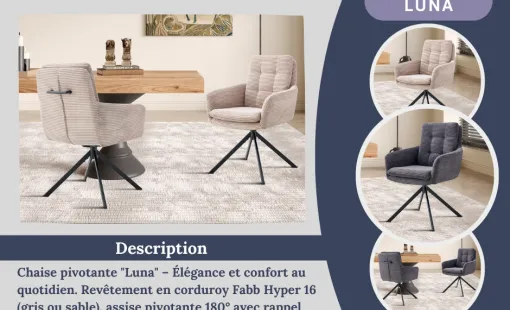 Réinventez votre espace repas ou votre coin bureau avec la chaise "Luna", une pièce de mobilier qui allie à merveille un design contemporain, un confort supérieur et une fonctionnalité ingénieuse.…