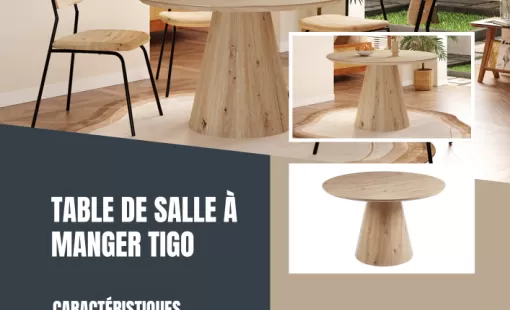 Craquez pour la table de salle à manger "TIGO", une pièce maîtresse qui allie un design contemporain à la chaleur du bois. Son plateau rond généreux, avec une épaisseur de 25 mm, repose sur un pied…