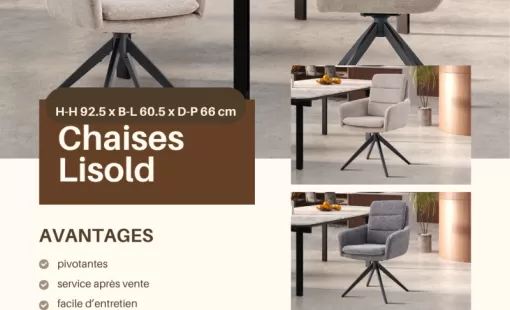 Ajoutez du confort et du style à votre salle à manger ou votre bureau avec la chaise Lisold, un modèle pivotant à l’assise généreusement rembourrée et au design contemporain.
